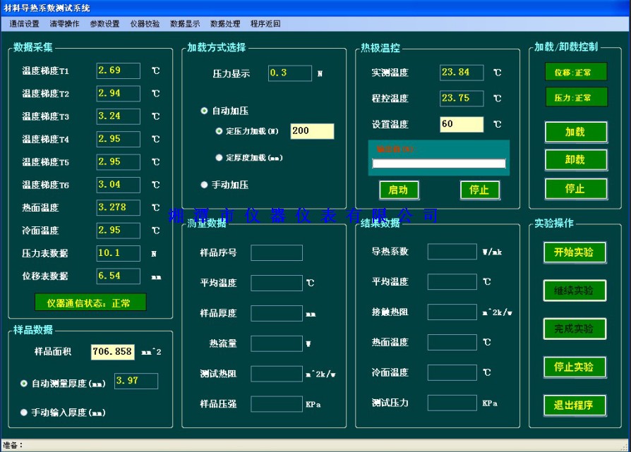 儀器特點:自動加壓,自動測厚,實驗全自動控制。6點溫度梯度檢測,提高測試精度??蓹z測不同壓力下熱阻曲線,采用優(yōu)化的數(shù)學模型,測量材料導熱系數(shù)和熱阻以及界面處接觸熱阻等。